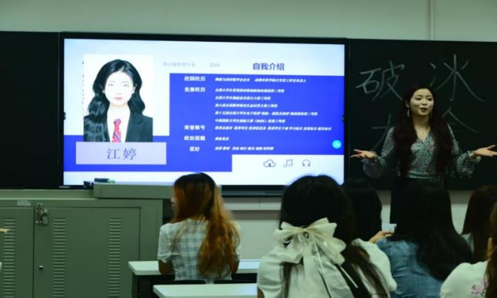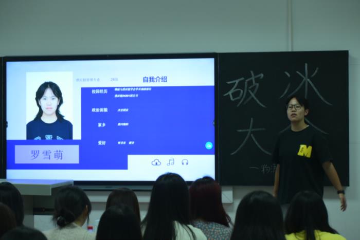 首先是竞赛部部长石静怡携同副部长吴巳洪、聂思雨、任璐上台,她们分别介绍了自己部门的招新计划和任职要求。